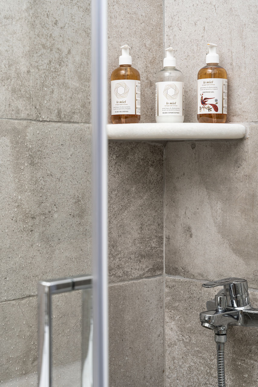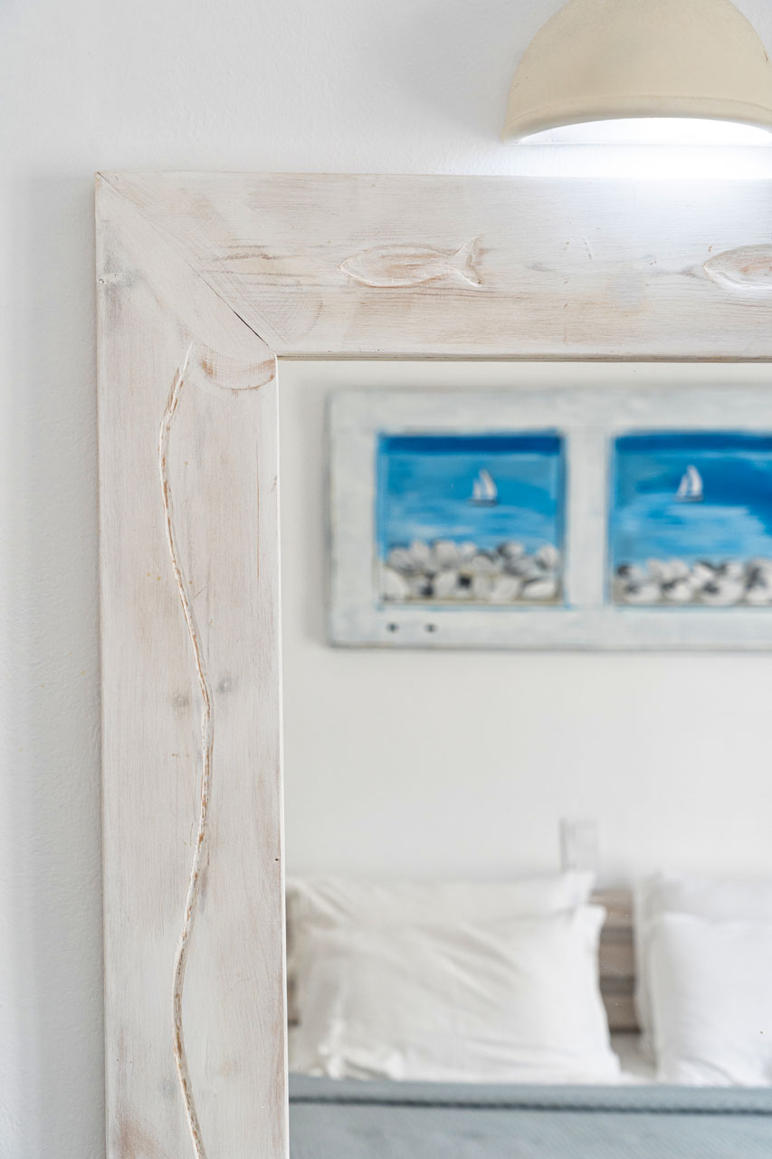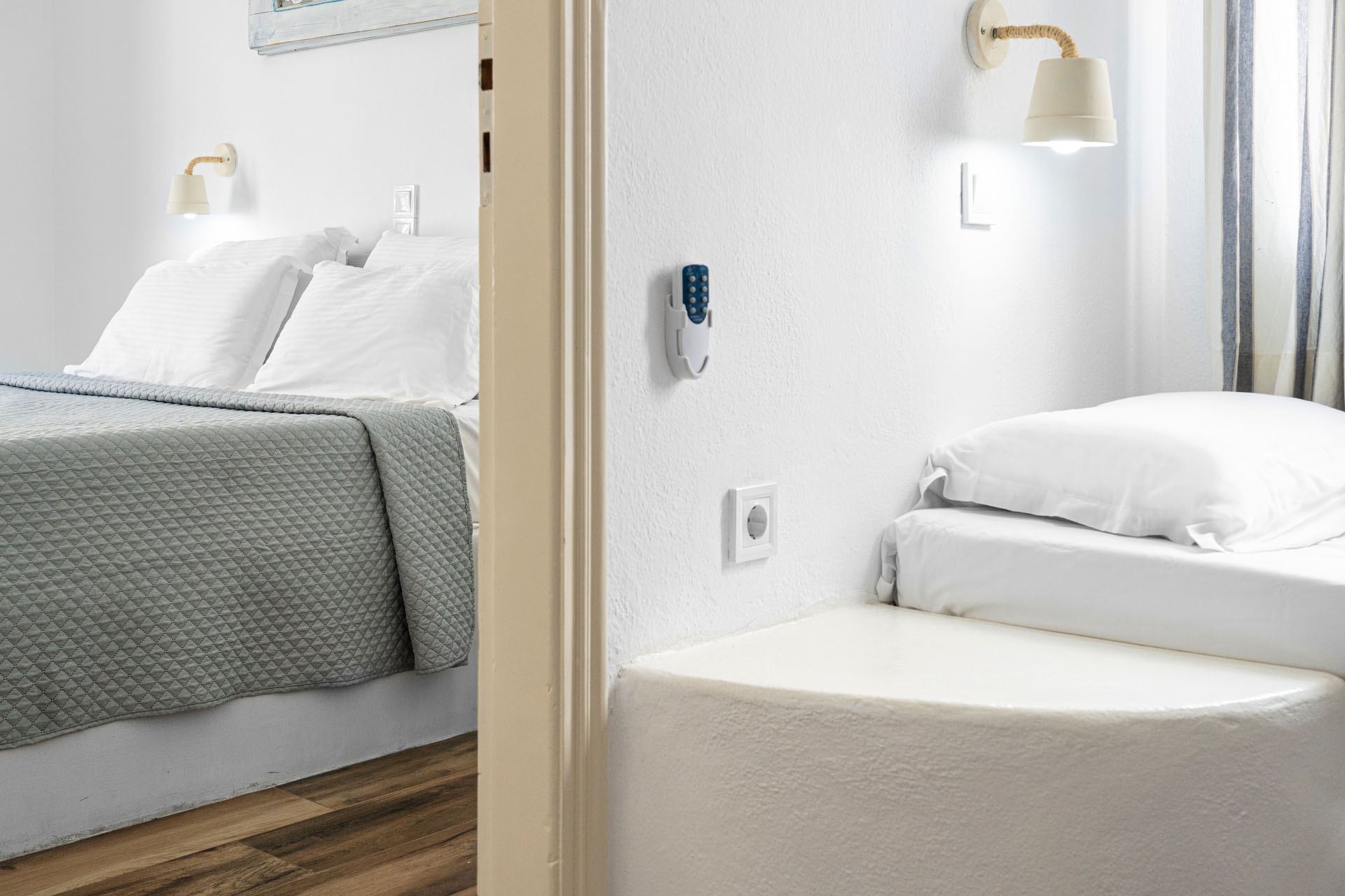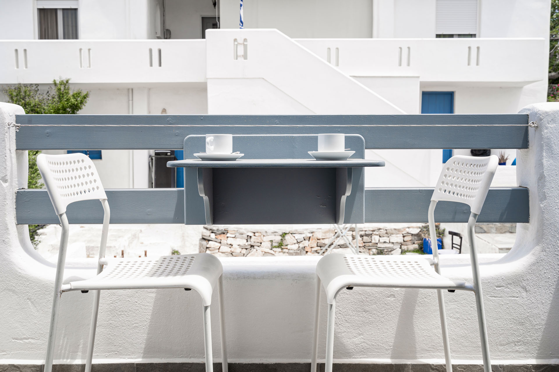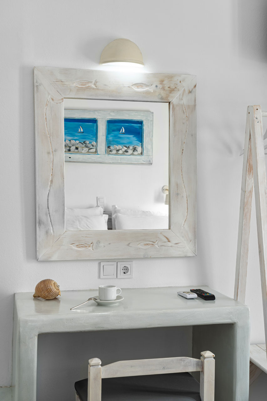 Our two bedroom family room decorated with Cycladic touch and a private balcony facing the narrow streets of Naousa